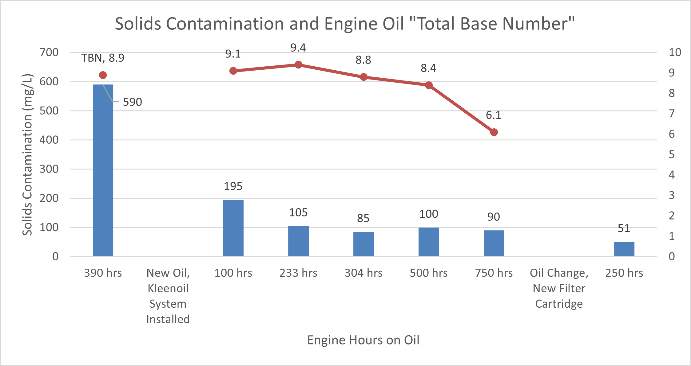 Before installing the Kleenoil system, the engine oil was changed at regular service intervals. During routine maintenance an oil sample was collected, and the solids contamination was measured using a Millipore test by passing the dirty oil through a 0.8 μm membrane filter (μm is micrometer, or one-thousandth of a millimeter. For reference, human hair is 20-200 μm wide). There was 390 engine hours on the oil, and the weight of contaminants measured 590 mg/L.