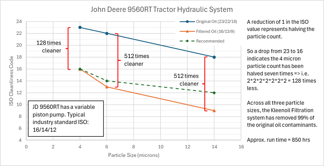 Hydraulic oil samples were taken before installing the Kleenoil Bypass Filter system and 850 hours after. The results below show that the original oil cycling through the hydraulic components of this tractor was well beyond the recommended cleanliness. Allowing the fluid to circulate through the Kleenoil filter removed over 400,000 particles per mL (99% of original contaminants) and brought the hydraulic fluid back to within standards.